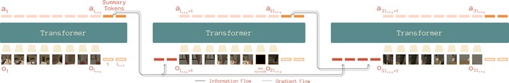 To enable embodied agents to assist and operate effectively over extended timeframes, it is crucial to develop models capable of forming and accessing memories to remain contextualized in an environment. In the current paradigm of training transformer-based policies for embodied sequential decision-making tasks, visual inputs often overwhelm the context limits of transformers, while humans can maintain and utilize a lifetime of experience compressed as memories.Significant compression of raw experience is possible in principle, as large portions of information are irrelevant and can be abstracted and compressed. However, existing approaches predominantly focus on either recurrent models with fixed-size memory or transformers with full-context reliance. In this work, we propose Memo, a transformer-based architecture and training recipe for reinforcement learning on memory-intensive, long-horizon tasks. Memo incorporates the creation and retrieval of memory by interleaving periodic summarization tokens with the input-output of a model during training. We demonstrate Memo’s effectiveness on a grid-world meta-reinforcement learning benchmark and a multi-object navigation task in photo-realistic indoor settings. Memo outperforms naive long-context transformer baselines while being more compute - and storage - efficient. Additionally, Memo generalizes better to longer contexts at inference time and remains robust in streaming settings, where historical context must be truncated to fit inference constraints.